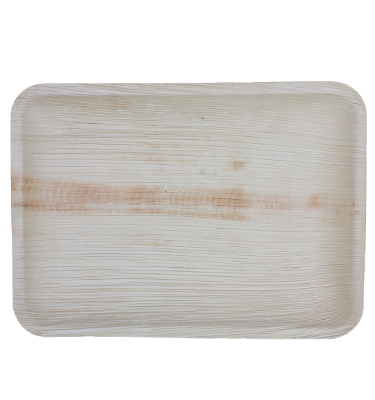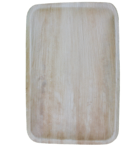 Our 14″ x 10″ rectangular Areca palm leaf trays combine strength, style, and eco-conscious design. Crafted from naturally fallen areca palm leaves, each tray is gently cleaned and steam-pressed into shape .