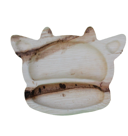 Our cow-shaped Areca Palm Leaf plate . Crafted in India from naturally fallen palm leaves, these bowls are cleaned, steam-pressed into shape, and made without any chemicals or synthetic coatings.